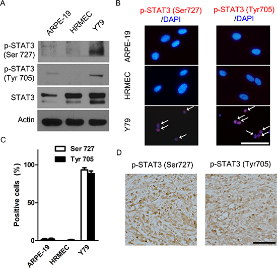 Figure 3: STAT3 is activated in retinoblastoma cells and in vivo orthotopic tumors. (A) pSTAT3Ser727 and pSTAT3Tyr705 in whole cell extracts of ARPE-19 cells, HRMECs, and Y79 cells. (B) Representative images of immunocytochemical staining of pSTAT3Ser727 and pSTAT3Tyr705 in ARPE-19 cells, HRMECs, and Y79 cells. White arrows indicate positively stained nuclei. (C) Quantitative analysis of immunocytochemical staining. (D) A representative example of the expression of pSTAT3Ser727 and pSTAT3Tyr705 in Ki-67 positive areas of in vivo orthotopic tumors at 4 weeks after intravitreal injection of Y79 cells (n = 6). All scale bars represent 50 μm.