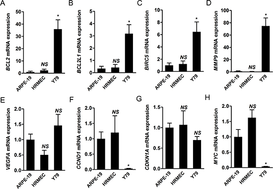 Figure 4: Target genes of STAT3 are differentially expressed in retinoblastoma cells compared to other retinal constituent cells. (A-H) We evaluated the relative levels of mRNA expression of various target genes of STAT3 from ARPE-19 cells, HRMECS, and Y79 cells under normal culture conditions through real-time PCR analysis. A, BCL2. B, BCL2L1. C, BIRC5. D, MMP9. E, VEGFA. F, CCND1. G, CDKN1A. H, MYC. NS, not significant (P > 0.05); *P < 0.05.
