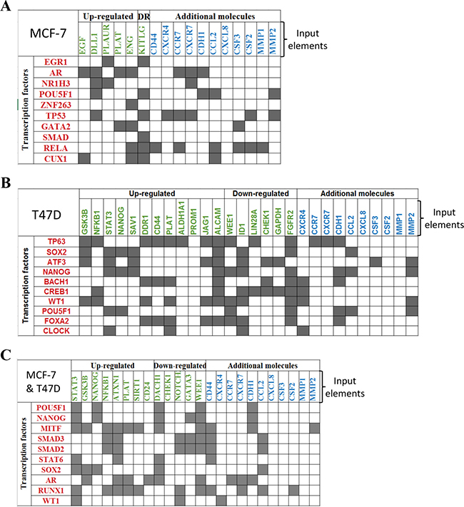 Figure 2: ChiP-X enrichment analysis of ChEA database infers transcription factors regulating the induced invasive/stemness phenotype. Transcription factors (TF) inferred during this analysis are shown in red. These TFs are potential upstream regulators of the genes found with the CSC gene expression array (shown in green) and other molecules that we previously found experimentally, shown as additional molecules in blue [15]. This analysis was performed individually to MCF-7 cells (A), T47D cells (B) and for the genes observed with the jointed analysis of both cell lines (C).
