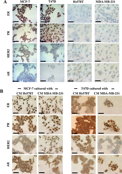 Figure 4: Induced invasive/CSC-like cells do not alter their luminal phenotype but turn on expression of AR. Immunohistochemistry of ER, PR, HER2, and AR expression in (A) all BrC cell lines under basal conditions and (B) MCF-7 and T47D cells cultured with CM from HA-BrC cell lines. Positive cells are brown based on DAB chromogen. Nuclei were stained with hematoxylin (blue). The scale bars indicate 50 μm. Magnification 400×.