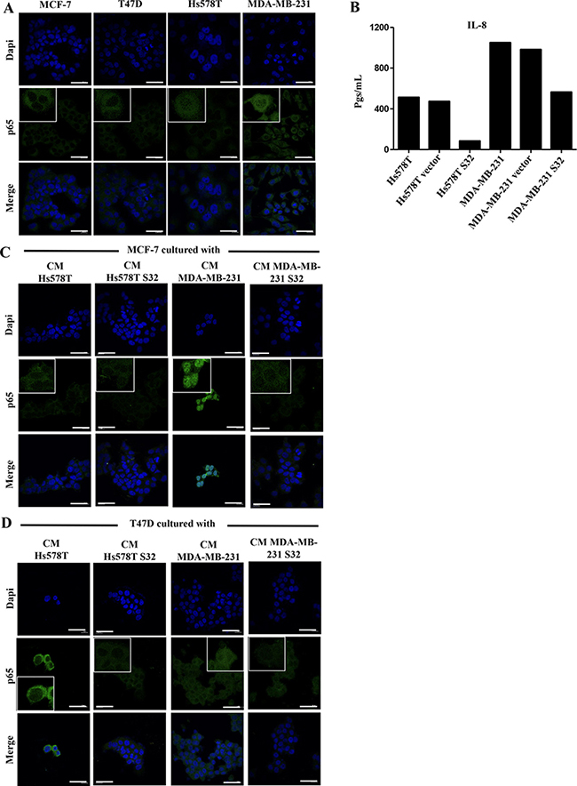 Figure 5: p65 is present in the nucleus of HA-BrC cells and its translocation to nucleus is induced in invasive/CSC-like NA-BrC cells. (A) Analysis of the constitutive cellular localization of p65 in NA- and HA-BrC cell lines by immunofluorescence (IF). (B) The concentration of IL-8 (in pgs/mL) was measured in the CM from the HA-BrC cell lines that were transiently transfected with a dominant negative IκB (HS578T S32 and MDA-MB-231 S32), and controls in which the cells were not transfected or transfected with an empty vector. p65 expression by IF in (C) MCF-7 and (D) T47D cells that were cultured with CM from HA-BrC cell lines HS578T S32 and MDA-MB-231 S32, and controls in which NFκB was not inhibited. The scale bars indicate 20 μm. Magnification 600× with inserts further amplifying the original image. Representative images are shown. Two independent biological replicates were analyzed and representative images were chosen.