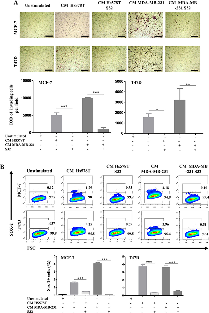Figure 6: The induced-invasive/stemness phenotype depends on p65 translocation. MCF-7 and T47D cells were cultured with the CM from HA-BrC cell lines in which the cells were transiently transfected with the dominant negative IκB (HS578T S32 and MDA-MB-231 S32), and controls in which NFκB was not inhibited. After 72 hours of culture (A) transwell invasion assays were performed and (B) SOX-2 expression was measured by FACS. Upper panels show representative images of invasion assays and cell density plots, while the frequency of invading cells and SOX-2 positive cells are graphed below. The data represent the mean ± SEM (Standard Error of the Mean) of 3 independent experiments, representative images are shown. *P < 0.05 and ***P < 0.001. The scale bars indicate 100 μm. Magnification 100×.
