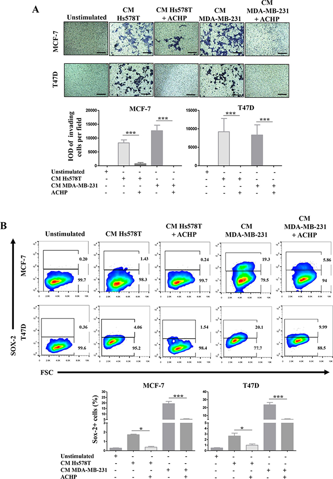 Figure 7. Pharmacological inhibition of NFκB activity blocks the induced-invasive/stemness phenotype. MCF-7 and T47D cells were cultured with CM from the HA-BrC cell lines in which the NFκB pathway was inhibited with ACHP or were treated with DMSO as vehicle control. After 72 hours of culture (A) transwell invasion assays were performed and (B) SOX-2 expression was measured by FACS. Upper panels show representative images of invasion assays and cell density plots, while the frequency of invading cells and SOX-2 positive cells are graphed below. The data represent the mean ± SEM of 3 independent experiments. *P < 0.05 and ***P < 0.001. The scale bars indicate 100 μm. Magnification 100×.