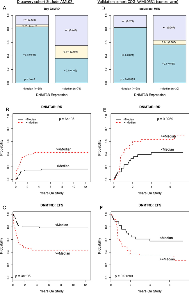 Figure 3: Greater DNMT3B expression associates with worse clinical outcomes in the multicenter AML02 and COG-AAML0531 clinical trials. (A) Stacked bar plot showing proportion of AML02 patients who were MRD negative (blue), had MRD < 1% (yellow), or MRD > 1% (purple) with less than median DNMT3B expression (left column) or greater than median DNMT3B expression (right column). (B) Cumulative incidence of resistant disease or relapse among AML02 patients with less than median DNMT3B expression (black line) or greater than median DNMT3B expression (dashed red line). (C) Kaplan-Meier estimates of EFS for AML02 patients with low DNMT3B expression (black line) and high DNMT3B expression (dashed red line). Panels (D), (E), and (F) provide analogous results for AAML0531 (control arm) patients.
