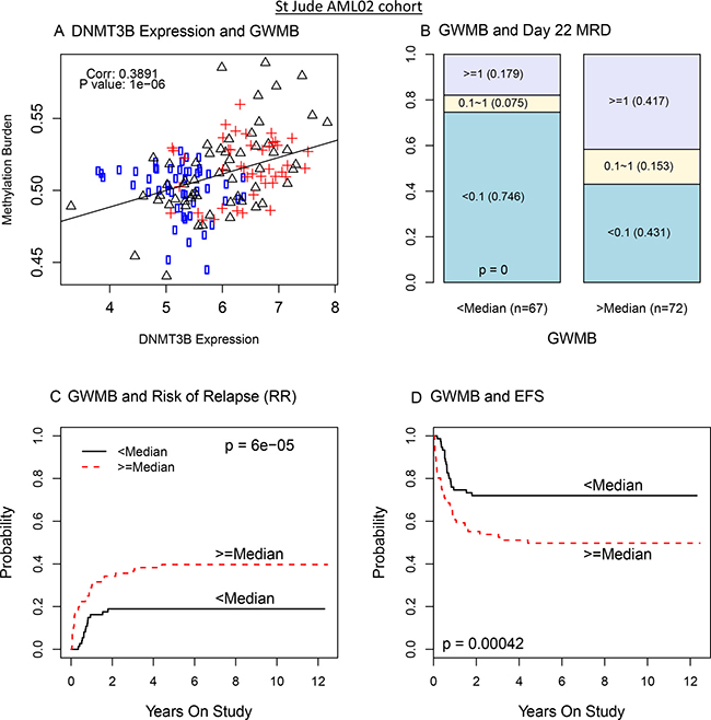 Figure 4: DNMT3B expression impacts genome wide methylation burden (GWMB) and GWMB is associated with outcome: AML02 cohort. (A) Scatterplot of DNMT3B expression with overall methylation burden (circle: low risk; triangle: standard risk; cross: high risk). (B) Bar plot of MRD according to GWMB. (C) The cumulative incidence of risk of relapse and resistance disease in pediatric AML according to GWMB. (D) The cumulative incidence of EFS in pediatric AML according to GWMB.
