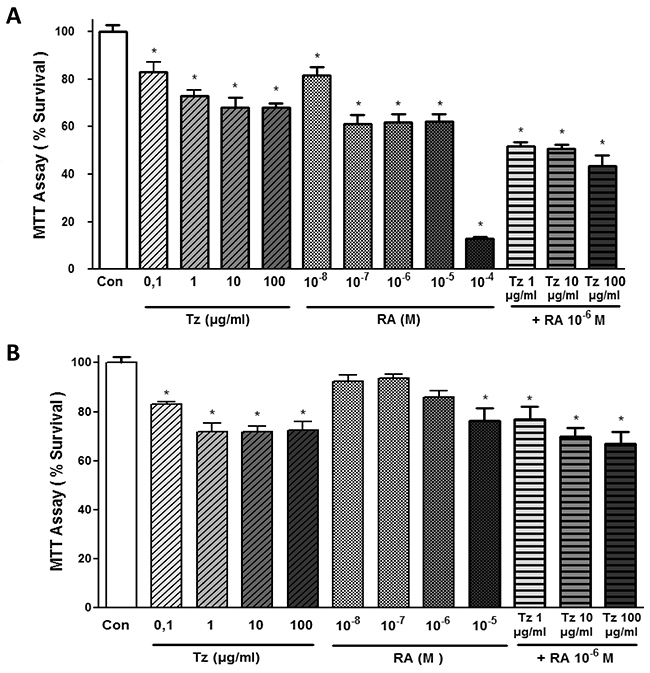 Figure 2: Tz, RA and the combination of both drugs decrease SKBR3 and BT-474 cell viability. MTT assay at different doses. (A) SKBR3 cells and (B) BT-474 cells were treated with increasing doses of Tz (0.1-1-10-100 μg/ml), RA (10-8-10-7-10-6-10-5-10-4 M) or the combination of Tz (1-10-100 μg/ml) with 10-6M RA for 72 h. The results express the percentage (%) of surviving cells compared to the control (Con, 100% survival). All data shown are representative of three independent experiments. Error bars indicate standard deviations. *P <0.05 vs. Control.