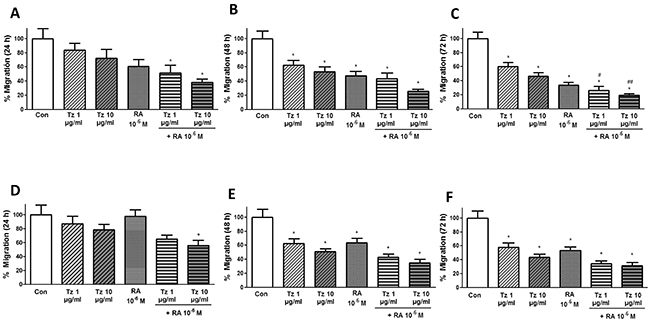 Figure 5: Tz and RA reduce cell migration. (A-C) SKBR3 and (D-F) BT-474 cells were grown in 96-well plates until they formed a monolayer; then, a “wound” was made. Treatments were applied for 72 h and cell migration was monitored by taking photographs. (A, D) 24 h (B, E) 48 h (C, F) 72 h of treatment. Gap closure was quantified with the use of NIH image J software. Experiments were performed in triplicate. *P <0.05 vs. Control (Con). #P <0.05 vs. 1 μg/ml Tz. ##P <0.05 vs. 10 μg/ml Tz.