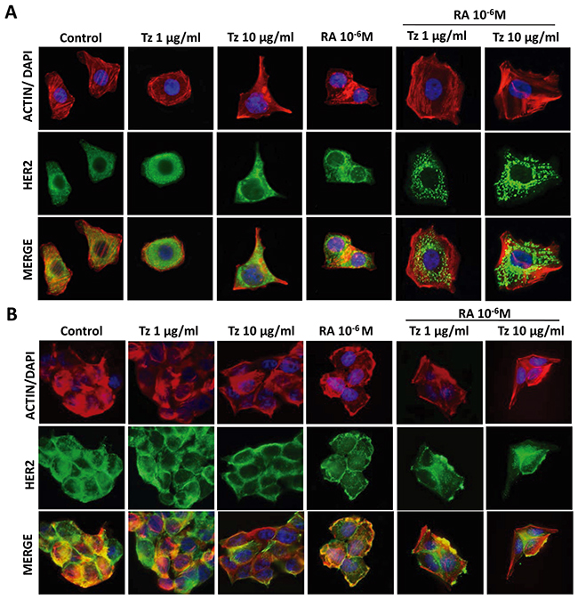 Figure 8: Tz and RA induce HER2 granular distribution. (A) SKBR3 and (B) BT-474 cells were treated for 72 h with 1 or 10 μg/ml Tz, 10-6M RA or the combination of both drugs. The cells were stained with HER2 linked to Alexa Fluor 488 (green); Actin was stained with Texas Red Phalloidin (red); and nuclei were counterstained with DAPI (blue). The images were captured using the Nikon Eclipse E200 fluorescence microscope coupled to a high resolution digital camera. All experiments were repeated three times with consistent results. Representative images are shown.