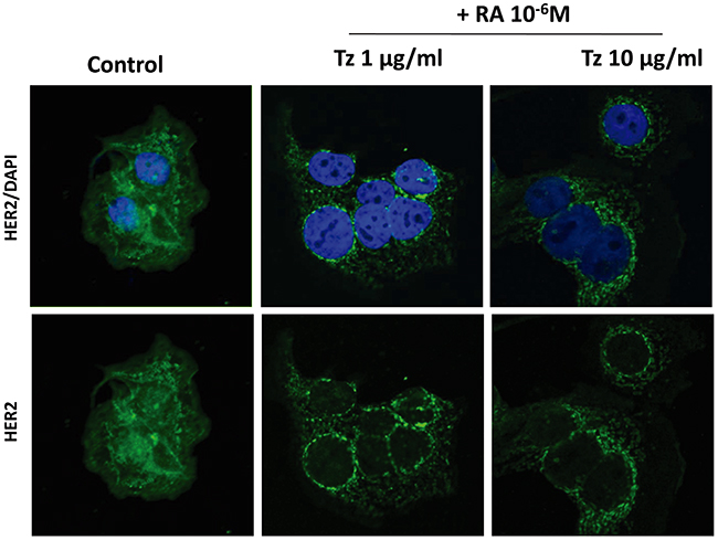 Combined treatment with Tz and RA induces HER2 receptor redistribution in SKBR3 and BT-474 cells
