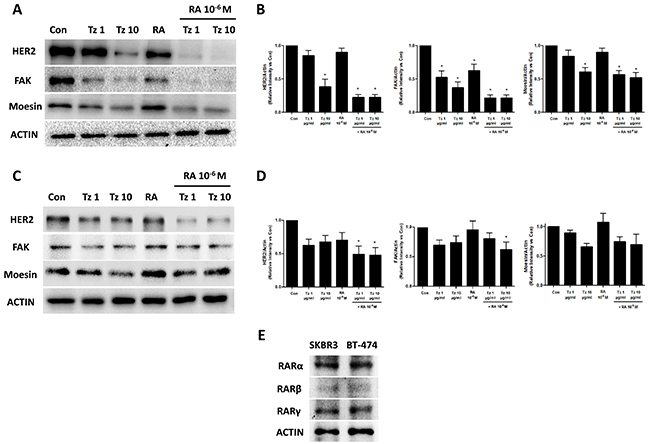 Figure 10: Tz and RA reduce HER2, FAK and Moesin expression. (A-B) SKBR3 and (C-D) BT-474 cells were treated for 72 h with 1 or 10 μg/ml Tz, 10-6M RA or the combination of both drugs. Expression of HER2, FAK, Moesin and ACTIN was evaluated by Western blot. (B and D) HER2, FAK and Moesin densitometry values were adjusted to ACTIN intensity, respectively, then normalized to the control sample. *= P<0.05 vs. corresponding control. (E) RARα, RARβ and RARγ expression were visualized in SKBR3 and BT-474 cells. ACTIN expression was used as charge control. Experiments were performed three times.