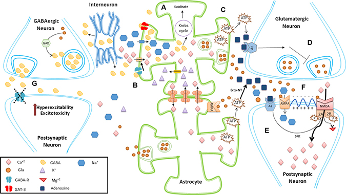 Figure 1: Schematic representation of excitatory and inhibitory effects of astrocytes. (A) Astrocytes help to remove synaptic and perisynaptic GABA released from neurons, controlling GABA effects. In astrocytes, GABA can then be metabolized to succinate. (B) Activation of astrocytic GABA receptors induce depolarization of astrocytes by activation of voltage-gated Ca2+ channels, which in turn increases intracellular astrocyte Ca2+ concentrations. Furthermore, gap junction-coupled astrocytes can exchange Ca2+ with K+, helping to maintain both extracellular and intracellular homeostatic balance. (C) A rise in the intracellular calcium levels of astrocytes promotes the release of ATP, which in turn is converted into adenosine through the action of extracellular ecto-NT. (D) Adenosine acts on presynaptic neurons inhibiting the release of Glu. (E) Adenosine also acts on A1 receptors located in postsynaptic neurons, leading to phosphorylation of NR2A and NR2B subunits of NMDA receptor (mediated through SFK), reducing the endocytosis of these Glu receptors. Thus, astrocytic gliotransmission can help maintain the surface expression of postsynaptic NMDA receptors (F). Glu released from astrocytes can activate AMPA postsynaptic receptors, inducing neuronal depolarization and further removal of NMDA magnesium block. This allows the entry of calcium to the cell, which is important for many cell processes such as memory, but which also can induce excitotoxicity if not regulated properly. Astrocytes also express AMPA, but is not entirely clear how this may relate to SE. (G) Astrocytes convert Glu into Gln, which is transported into GABAergic neurons. Gln is converted into Glu and then into GABA thanks to the action of GAD. Under normal conditions, GABA can act on postsynaptic GABA receptors exerting inhibitory effects. Malfunction or blocking of these postsynaptic GABA receptors can lead to hyperexcitability, excitotoxicity or continuous epileptogenic activity. Abbreviations: α-amino-3-hydroxy-5-methyl-4-isoxazolepropionic acid receptor (AMPA); Ecto-nucleotidases (ecto-NT); gamma-aminobutyric acid (GABA); glutamate (Glu); glutamic acid decarboxylase (GAD); glutamine (Gln); N-Methyl-D-Aspartate (NMDA); Src family tyrosine kinases (SFK).