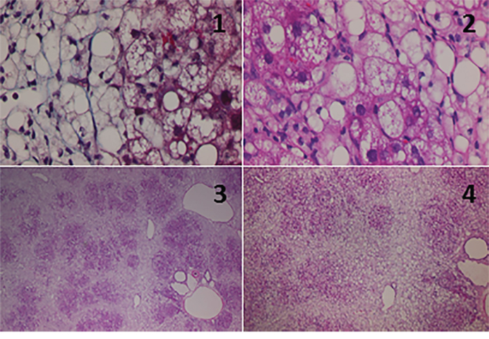 Figure 1: Histological findings for the livers from 19-week-old SHRSP5 rats from the high fat, high cholesterol-containing diet (HFCD) group. Masson’s trichrome stain (1) or hematoxylin and eosin (HE) stain (2-4). Original magnification: x100 (1, 2) or x4 (3, 4). Ballooning hepatocytes and pericellular fibrosis were observed (1, 2). Enlargement of the portal vein and increased numbers of portal vein branches were observed (3). Massive necrosis (collapse) of hepatocytes was also observed (4).