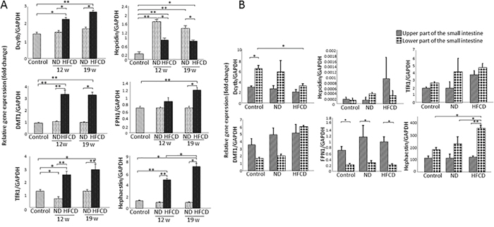 Figure 2: Real-time RT-qPCR analysis of the expression of iron metabolism-related genes (IMGs) in the liver and small intestine of SHRSP5 rats from the high fat, high cholesterol-containing diet (HFCD) or normal diet (ND) groups. (A) Expression of IMGs in the liver. (B) Expression of IMGs in the small intestine. Data represent mean ± standard deviation. For each parameter, the Turkey-Kramer test was used for comparisons among the 5-week-old group and the 12- and 19-week-old rats from the ND and HFCD groups. (*P<0.05; **P<0.001). FPN1, ferroportin 1; TfR1, transferrin receptor 1; DMT1, divalent metal transporter 1; Dcytb, duodenal cytochrome b; GAPDH, glyceraldehyde-3-phosphate dehydrogenase.