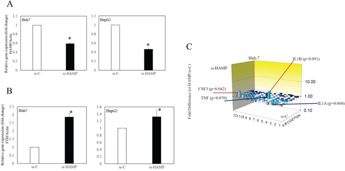 TLR-associated signaling target PCR array was also performed using Huh7 transfected with si-HAMP and those transfected with si-C. IL1β and colony stimulating factor 3 (CSF3) were upregulated 3.0-fold and 2.5-fold in Huh7 transfected with si-HAMP, compared with si-C-transfected cells (p=0.091 and p=0.042, respectively). TNF and IL1α were downregulated 2.3-fold and 2.2-fold in Huh7 transfected with si-HAMP (p = 0.070 and p = 0.060, respectively) (Figure 4C). The expression of HAMP mRNA might be associated with cytokine gene expression in human hepatocytes.