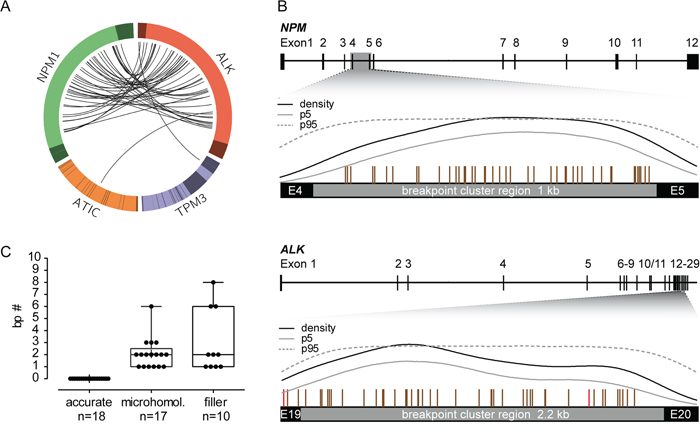 Detailed characterization of the NPM-ALK fusion sites showed small microhomologies (1 to 6 bp) in 38% of patients and small fillers (1 to 8 bp) in 22% of patients (Figure 1C). These findings indicate that the formation of NPM-ALK translocations in ALCL involves inaccurate non-homologous end joining (NHEJ) repair mechanisms [20].