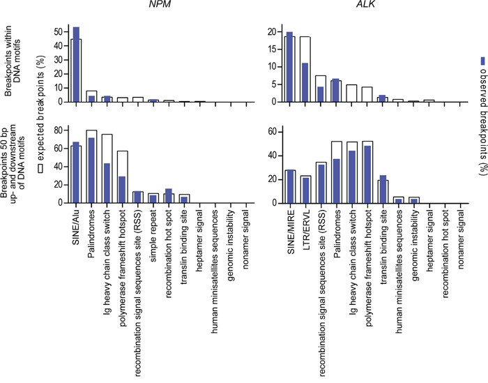 Figure 2: Localization of genomic breakpoints. Co-localization of genomic breakpoints to repeat regions and DNA sequence motifs that could support the initiation of ALCL chromosomal translocation. White columns represent the numbers of expected breakpoints; blue columns represent the numbers of observed breakpoints within the corresponding DNA motif.
