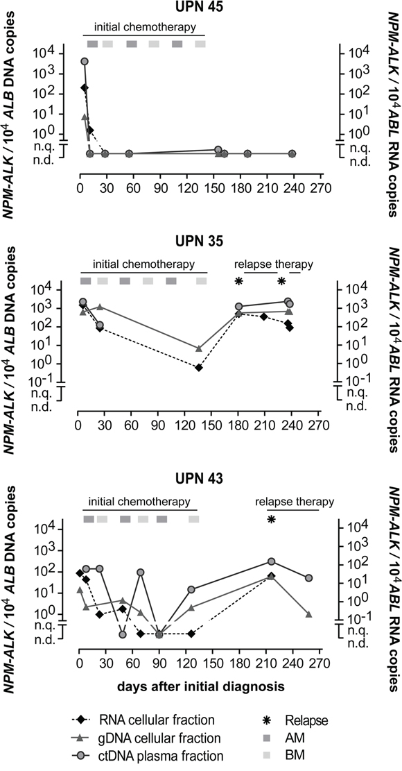 Figure 4: Quantification of NPM-ALK in ALCL patients. NPM-ALK fusion RNA, DNA and ctDNA copies in 3 ALCL patients during their disease course. (AM… course of dexamethasone, methotrexate, ifosfamide, cytarabine and etoposide; BM… course of dexamethasone, methotrexate, cyclophosphamide and doxorubicine).