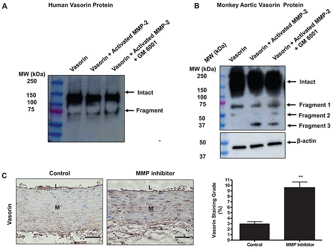 Figure 4: Vasorin is an MMP-2 substrate. (A) Representative western blots of vasorin showing that the purified human vasorin was cleaved by the activated MMP-2. Recombinant human vasorin (400 ng/ml) was incubated in a developing buffer containing activated MMP-2 (50 nM) with or without an MMP inhibitor GM6001 (20 nM) for 24 hours at 37°C (n= 4 independent experiments). Western blots were probed with vasorin antibody, which detected the intact vasorin (~100 kDa) and a soluble fragment (~75 kDa). (B) Representative western blots of vasorin showing that the monkey aortic homogenate containing vasorin was cleaved step-wisely by MMP-2. Monkey aortic lysates (25 μg/ml) were incubated in a developing buffer containing activated MMP-2 (50 nM) with or without an MMP inhibitor GM6001 (20 nM) for 24 hours at 37°C (n= 3 independent experiments from 3 monkeys). Western blots were probed with vasorin antibody, which detected the intact vasorin (~100 kDa) and three soluble fragments (~75 kDa, 50 kDa, and 37 kDa) showing intact arterial vasorin was processed by activated MMP-2. (C) Representative immunohistostaining of vasorin (brown, X400) of aortae harvested from adult young rats administrated with either the MMP inhibitor PD166793 (MMP inhibitor) or vehicle 0.1% dimethyl sulfoxide animals (control). All micrographs were taken at the same exposure time. Data of relative vasorin staining area (%) (right panel) shown as mean ± SEM (n= 5 rats/group). T-test, **=p<0.01. L=lumen; M=media. Bar scale, 10 μm.