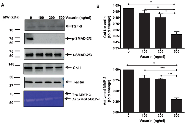 Figure 8: TGF-β1 downstream profibrotic effects in old VSMCs regulated by recombinant human vasorin proteins. (A) Representative western blots of TGF-β1, p-SMAD-2/3, SMAD-2/3, Coll I, β-actin, and Zymogram from lysates of early passage cultured VSMCs treated with or without recombinant human vasorin proteins at the indicated doses. (B) Data shown as mean ± SEM (n=3 independent/group). Each column represents a normalized ratio (fold-change) to β-actin and to untreated control (0). One-way ANOVA followed Bonferroni post hoc test, *=p<0.05, **=p<0.01 and ***=p<0.001.