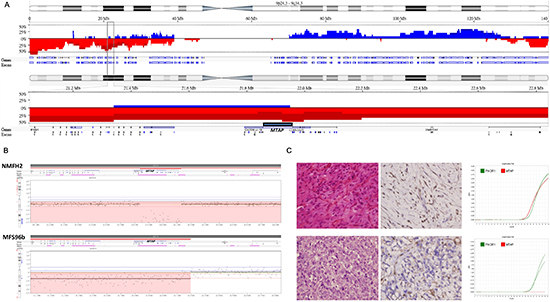 Figure 1: MTAP homozygous deletion in myxofibrosarcoma. (A) Referring to chromosome 9 cytoband, genomic profiling exhibits near arm-level losses of 9p clustered in five major deletion cores (top). Within the middle deletion core (9p22.2-p21.1), homozygous deletions frequently involves the aggressiveness-associated 9p21.3 region as delineated by the rectangle (middle). At higher magnification, the genomic locus of MTAP gene in the 9p21.3 region is illustrated (bottom). Frequency plots of the CNAs are expressed in blue (gain) or red (loss). (B) The close-up view of representative myxofibrosarcoma cell line (NMFH-2) and tissue (MFS96b) samples shows the homozygous deletion of the MTAP gene. Intratumoral nonneoplastic cells in MFS96b account for the less prominent loss of MTAP copies. (C) Upper: A Grade 1 myxofibrosarcoma stained with hematoxylin-eosin (left) shows diffused MTAP expression (middle) and a preserved MTAP gene, shown as the red curve in a quantitative DNA-PCR (right). Lower: A Grade 3 myxofibrosarcoma stained with hematoxylin-eosin (left) shows MTAP-deficient sarcoma cells (middle) and the nondetectable MTAP gene (right).