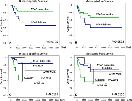 Figure 2: MTAP protein deficiency predicts adverse disease-specific (A) and metastasis-free survival (B) rates. Myxofibrosarcomas involving homozygously deleted MTAP genes yield significantly poor outcomes for both survival endpoints (C, D) and MTAP-expressing and MTAP-methylated cases did not differ prognostically.