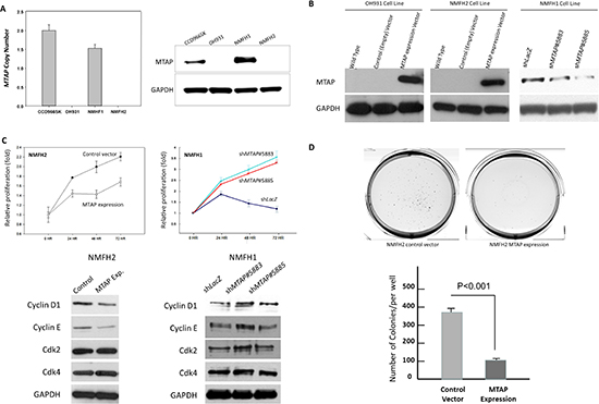 Figure 3: In vitro growth-inhibiting function of MTAP linked to downregulated cyclin D1. (A) Compared with reference CCD966SK fibroblasts, the OH931 and NMFH-2 cell lines were homozygously deleted at the MTAP gene; no DNA copy was detected using real-time PCR (left) and the western blots exhibited no MTAP expression (right). Although the MTAP gene dosage was slightly decreased, a western blotting assay revealed MTAP-expressing NMFH-1 cells. (B) Stable exogenous MTAP reexpression was achieved in the OH931 (left) and NMFH-2 (middle) myxofibrosarcoma cell lines, and the western blots exhibited the expected bands using anti-MTAP. Two clones of shMTAP stably downregulated MTAP expression in NMFH-1 cells exhibiting decreased protein abundance (right), compared with the non-targeting shLacZ controls. (C) The BrdU readout, indicating the level of proliferative activity, was significantly reduced in stable MTAP-transfected NMFH-2 cells (left), but increased in MTAP-silenced NMFH-1 cells (right), compared with the corresponding controls. Depending on the MTAP expression status, only the expression level of cyclin D1 in western blots was consistently altered as expected among the MTAP-reexpressing NMFH-2 cells and 2 MTAP-knockdown clones of the NMFH-1 cells. (D) Compared with the empty controls (left), the MTAP-reexpressing NMFH-2 transfectants (middle) formed fewer colonies on soft agar, as expressed in the histogram (bottom).