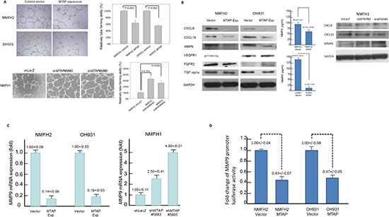 Figure 4: MTAP governs tumor angiogenesis by the transcriptional repression of MMP-9. (A) The well-formed HUVEC tubes decrease when exposed to conditioned media from MTAP-reexpressing transfectants of NMFH-2 and OH931 cells. Conversely, MTAP knockdown promoted angiogenesis in both shMTAP-transduced clones of the NMFH-1 cells (left). The relative level of angiogenic tube-forming activity is expressed in the histograms (right). (B) Of the differentially expressed genes identified from the RT-PCR expression array, western blotting validation for both MTAP-reexpressing transfectants exhibited correspondingly decreased protein expression of CXCL-9, CXCL-10, and MMP-9 (left). The MMP-9 protein concentration secreted into the conditioned media was significantly reduced in MTAP-reexpressing NMFH-2 and OH931 cell lines (middle). Only the level of MMP-9 protein expression was significantly upregulated in the cross-validation of MTAP-silenced NMFH-1 cells (right). (C) As a representative potential downstream mediator of MTAP, the MMP-9 mRNA expression levels were significantly downregulated in the MTAP-reexpressing NMFH-2 and OH931 cells (left) but elevated by MTAP knockdown using quantitative RT-PCR (right). (D) Luciferase activity of MMP-9 promoter construct was significantly lower in the NMFH-2 and OH931 cells transfected with the MTAP-expressing vector than in the empty controls. All experiments were performed in triplicate, and the results are expressed as mean ± SD.