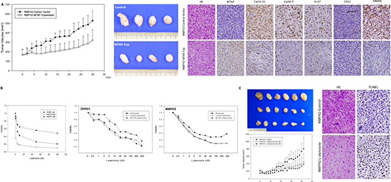 Figure 5: In vivo tumor suppressive function of MTAP and the inhibition of L-alanosine in MTAP-deficient myxofibrosarcoma. (A) The average tumor volume of the empty vector-transfected NMFH-2 xenografts was significantly larger than that of the MTAP-reexpressing counterparts (left). On Day 30, the excised xenografts were grossly larger and heavier in the control group than in the MTAP-reexpressing group (middle). Histologically, control xenografts (upper panel) comprise MTAP-deficient high-grade pleomorphic sarcoma cells that exhibit frequent mitotic figures, the increased expression of cyclin D1, cyclin E, Ki-67, and MMP-9, and an increased microvascular density based on CD31 staining. However, contrasting results were observed in the MTAP-reexpressing group (lower panel), which exhibited low-grade MTAP-expressing spindle cells (right). (B) L-alanosine effectively attenuated the viability of MTAP-deficient NMFH-2 and OH931 myxofibrosarcoma cell lines, and MTAP-expressing NMFH-1 cells were relatively resistant to L-alanosine, demonstrating >50% viable sarcoma cells, even at 100 μM (left). Unlike the sensitivity in the parent lines and empty controls, MTAP reexpression caused decreased susceptibility to L-alanosine in the OH931 (middle) and NMFH-2 (right) cells. (C) The average tumor volume was significantly larger in the PBS-treated group than in the groups treated with 25 μM and 50 μM of L-alanosine (left). On Day 42, the excised xenografts remained macroscopically larger and heavier in the control group, exhibiting no dose-dependent difference between the groups treated with 25 μM and 50 μM of L-alanosine (middle). In contrast to the high-grade pleomorphic histology in the control xenografts lacking apparent apoptosis, the L-alanosine-treated group exhibited increased numbers of fibrohyaline collagen fibers and TUNEL-labeled apoptotic cells (right).