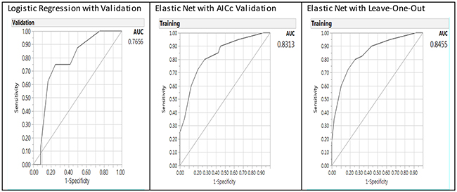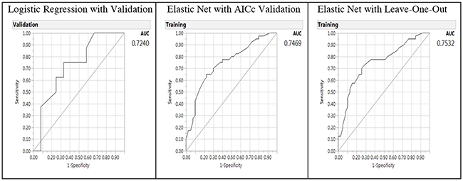 In the final stage of model prediction, we used GR to obtain a smaller prediction error [68]. The methodology of JMP Pro allows for several classes of modeling estimation methods including Lasso, Forward Selection and Elastic Net and several validation methods including the one we chose of LOO cross validation. This validation technique has been shown to be effective for small data sets. Model performance was assessed using misclassification rate (smaller is better), AICc (smaller is fitter), and AUC (larger is better) [73]. GR is also known as penalized regression, meaning that the variable selection process penalizes complexity. To get the optimal model, the algorithm imposes a penalty on the model when redundant predictors are included. When there are several collinear predictors, LASSO select just one and ignore others, or zero out some regression coefficients. The Ridge method counteracts against collinearity and variance inflation by shrinking the regression coefficients towards zero, but not exactly zero. The Elastic Net method combines the penalties of the LASSO and Ridge approaches. Unlike linear least squares in estimating the unknown parameters in a linear regression model, GR could simply zero out certain unused predictors [74]. In this case the p value at most could only be.9999, but not exactly one in linear regression model. However, when all permutations are exhausted, such as what was done in an exact test, the probability could be exactly one. In a similar vein, GR exhausted different paths to find the best model. When the full model has a mixture of important and unused predictors, the p value cannot be one. However, when the data could be perfectly described by the restricted model resulted from path searching, the probability of observing the data could be 1.