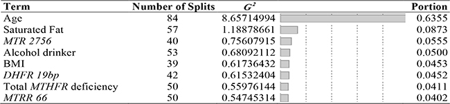 In the second stage, dimension or data reduction, our strategy was to identify the most influential predictors within three categories of genetic, demographic and lifestyle, and dietary factors (as indicated by the health metrics). To select the most influential predictors within each category, we used the criteria of column contribution (variables of importance). Using the bootstrap forest ensemble method, G2 and portion of column contribution per variables were used to present the rank order of importance.