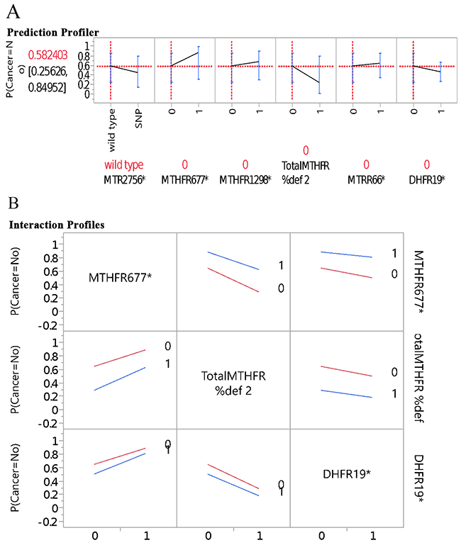 Table 2 presents the comparisons of gene polymorphisms between the control and the BC groups. Between the two groups, the total gene polymorphism-mutations of the five chosen genes in the OCM pathway ranged from 0 to 7 in control group and 1-5 in BC group. Wild type and polymorphism-mutations per gene were scored, i.e. wild type was scored “0”, heterozygote was scored “1” and homozygote was scored “2”, with a total possible maximum score of 10 for the five genes combined. To decrease the degrees of freedom and increase the power in the statistical testing, total mutation score was recoded into two groups using the median split between less than 3 and ≥ 3 in the predictive modeling. MTHFR enzyme deficiency was calculated by combining the loss of enzymatic functions from polymorphisms of MTHFR 677 (loss of 35% for each of the two T polymorphic alleles) and MTHFR 1298 (loss of 15% for each of the two C polymorphic alleles) resulting to a total score of both MTHFR 677 and 1298 deficiency (possible maximum score of 100) [29, 30] (Table 2). No significant difference between the control and BC groups was noted for each gene alone and score on the MTHFR deficiency. There were no significant differences on each of the five gene polymorphisms between the control and BC groups. However, presented the directions of genes polymorphism-mutations of case and control groups. MTR2756, total MTHFR deficiency, and DHFR19bp showed the trend of increased polymorphism-mutations in BC group.