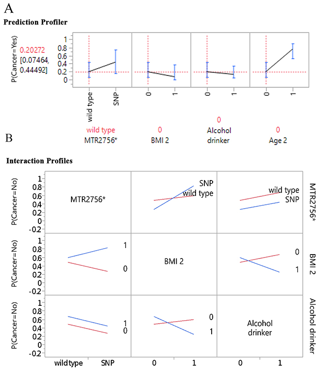 Using the ensemble method, the most influential gene-environmental factors were polymorphisms of MTR 2756, age, alcohol consumption, and BMI for the total sample. Utilizing the most influential factors, the two models, LR and GR models using LOO cross validation methods had presented the novel gene-environment interactions and predictors of BC. In the model, BMI status was significantly interactive with both alcohol and MTR 2756 polymorphisms. Previous studies presented possible obesity-promoting effects of energy intake from alcohol use [42]. On the BMI and MTR 2756 interaction, individuals who were overweight and obese had higher odds of low folate intake compared to normal-weight adults [45]. Low folate intake affects the enzymatic activity of MTR 2756 in maintaining adequate intracellular folate, methionine, which is an essential amino acid involved in DNA methylation [20]. Previous studies had presented gene-environment interactions associating genes in the OCM pathways with folate deficiency and BC [36, 10, 20, 26]. This study has presented new and novel results using predictive modeling and validation analytics on the interactions among predictors affecting epigenetic mechanisms. We presented the very first study using these new analytics to triangulate and cross-validate the findings using both conventional inferential statistics as well as ensemble method and GR models to predict BC risk for prevention efforts.