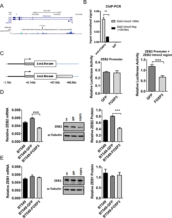 Figure 1: FOXP3 targeting of ZEB2 but not ZEB1. (A) Schematic of the human ZEB2 gene (top), FOXP3 binding region (middle) and human ENCODE data for H3K27ac marks (bottom). (B) ChIP-PCR on cross-linked material from FOXP3 overexpressing BT549 cells using either rabbit anti-FOXP3 polyclonal Ab or chip grade control rabbit IgG sera. The relative enrichment of target regions in FOXP3-and control IgG immunoprecipitated material relative to input chromatin was calculated using the 2−ΔΔCT method. This input normalised signal was then plotted. A representative experiment, with triplicate samples, of three experiments is shown, mean + SD. A one sample two- tailed t test was applied (**P < 0.01). (C) Schematic representation of the luciferase reporter constructs. Constructs in pGL4.10 incorporating ZEB2 promoter sequences alone (11.7 kb to + 0.1 Kb relative to TS), (Promoter) or the ZEB2 promoter and the FOXP3 binding region in intron 2 (+ 67 kb to + 68.6Kb downstream of the ZEB2 TSS), (Promoter + Intron). The mean normalised luciferase activity from constructs transfected into FOXP3 or GFP overexpressing BT549 cells is shown + SD. n = 3. Two tailed Student’s t test, ***P < 0.001. (D) ZEB2 expression in WT, and GFP or FOXP3 overexpressing BT549 cells. Relative abundance of ZEB2 mRNA normalised to reference gene RPL13a is plotted (left). Reactions for quantitative real -time PCR were run in triplicate and the means of the threshold cycles (Cts) were used for quantitation. A standard curve to determine amplification efficiency was generated for ZEB2 and for the reference gene RPL13a mRNAs (see Methods section). The standard curve method for relative quantitation was used to determine the relative abundance of ZEB2 mRNA normalised to the RPL13a reference gene mean + SD (left) Student’s t test, ***P < 0.001 n = 3 experiments. ZEB2 protein by Western blot (middle, shown is a representative experiment) and quantitated relative to α Tubulin (right) mean + SD Student’s t test ***P < 0.001. n = 3 experiments. (E) ZEB1 expression in WT, and GFP or FOXP3 overexpressing BT549 cells. Relative abundance of ZEB1 mRNA was quantitated as in (D) above by qRT-PCR using the standard curve method for relative quantitation, and expressed relative to reference gene RPL13A mean + SD (left). ZEB1 protein by western blot (middle, shown is a representative experiment) and quantitated relative to α Tubulin (right) mean + SD. n = 3 experiments.