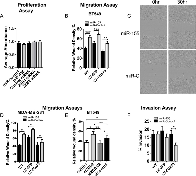 In order to demonstrate a link between gene expression and function, we next investigated the functional effect of ZEB2 loss on migration and invasion. Using siRNAs to ZEB1 and ZEB2 and miR-155 or controls, we first confirmed that neither increased miR-155 nor specific loss of ZEB2 or ZEB1 altered the proliferation of transfected BT549 cells (Figure 6A). A scratch wound assay using an IncuCyteZOOM™ was then used to model real time migration. Cell migration data was collected over a 50 hour time period and analysed using the Relative Wound Density software algorithms supplied. The relative wound density metric is the most accurate metric to assess cell migration. We found that in WT, GFP and FOXP3 expressing BT549 cells transfected with miR-155, migration was increased compared with control cells (Supplementary Figure 2A–2C; single experiment with 4 technical replicates). We used miR200b as a control since miR-200b downregulates both ZEB1 and ZEB2, and in our initial experiments we compared migration in miR-200b transfected BT549 cells with cells transfected with miR-155 or miR-control. In the miR-200b transfected cells there was very low cell migration (Supplementary Figure 2A–2C). We then collated the analysed migration data at a fixed time point of 40 hours from 6 experiments and this showed that migration was increased in WT, GFP and FOXP3 expressing BT549 cells transfected with miR-155 (35%, 26.5% and 32% increase respectively) relative to miR-control transfected cells (Figure 6B), indicating that loss of ZEB2 resulted in increased migration. A representative set of images of BT549 cells transfected with miR-155 or miR- Control (miR-C) shows initial scratch wounds at 0 hours and 30 hours thereafter (Figure 6C). Similar results were observed using a second highly invasive breast cancer cell line MDA-MB-231; cells transfected with miR-155 relative to miR-control transfected cells (40%, 24%, 14% increased migration in WT, GFP and FOXP3 cells respectively; Figure 6D). We then depleted ZEB2 in cells using siRNAs to determine whether migration was enhanced by direct depletion of ZEB2. We observed significantly increased migration in cells transfected with si-ZEB2 compared with si-Control (18% higher than si-Control) (Figure 6E). In contrast, cells transfected with si-ZEB1 had reduced migration compared with si-Control (18% lower than si-Control), and this is linked to the de-repression of E-cadherin and more adherent properties. The results from the siZEB1 siRNA experiments and the conclusions drawn are consistent with previous studies [52]. Migration in cells transfected with si-ZEB2 was significantly higher than in cells transfected with si-ZEB1 (32% higher) and interestingly, migration was decreased in cells transfected with si-ZEB1 and si-ZEB2 together compared with si-Control (21% lower) and also compared with cells transfected with si-ZEB2 alone (34% lower) (Figure 6E). Similar results were obtained using MDA-MB-231 cells (data not shown). These results provide a functional link with our findings that E-cadherin is not de-repressed when ZEB2 is depleted and as a result of this E-cadherin levels are low (Figure 5D). Cells are therefore less adherent than cells depleted of ZEB1 and therefore the migratory potential of cells with depleted ZEB2 is higher than in cells with depleted ZEB1. Since Vimentin expression is linked to the invasive potential of cells, we next examined the contribution of FOXP3 and miR-155 mediated ZEB2 loss to changes in cell invasion. Invasion was reduced by 40% in FOXP3 expressing BT549 cells treated with miR-155 relative to miR-control treated cells (Figure 6F). We suggest that reduced Vimentin expression resulting from the dual FOXP3 and miR-155 dependent down regulation of ZEB2, impairs invadopodia formation and this reduces invasion. We conclude that down regulation of ZEB2 by miR-155 and FOXP3 alters the migratory and invasive potential of breast cancer cells.