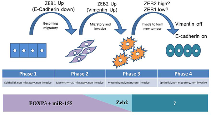 Maintenance of epithelial integrity involves multiple cell-cell adhesion complexes and cytoskeletal rearrangements and since ZEB2 has been shown to regulate other tight junction proteins [60], it is quite likely therefore, that FOXP3 and ZEB2, directly or indirectly, control waves of gene expression to create complex networks of protein interactions which help shape the process of EMT (and metastasis). This gives a new insight into the role of ZEB2 and also perhaps of ZEB1 in breast cancer metastasis (Figure 8). It is conceivable that the steady state expression of the tumour suppressor FOXP3 in healthy epithelium restrains oncogenes, including ZEB2, but cannot control ZEB1, so that loss of repression of ZEB1 (by other mechanisms) is an early step in transformation, and this decreases the expression of E-cadherin, facilitating migration (Figure 8 phase 1–2). If loss of FOXP3 then occurs, ZEB2 is no longer controlled, resulting in up regulation of Vimentin, leading to degradation of the extra-cellular matrix facilitating invasion (Figure 8 phase 2–3). In order for migratory and invasive (metastatic) cells to form a solid tumour at a new site, adherent properties need to be established. If E-cadherin needs to be upregulated, this could be facilitated by loss of ZEB1 expression, leaving ZEB2 unaltered (Figure 8 phase 3–4). This model is based on the observations from Figure 7 where removal of FOXP3 in HMEC resulted in both upregulation of Vimentin, and E-Cadherin. At the new tumour site de-repressed E-cadherin facilitates cell adhesion, and then inhibition of ZEB2, leads to reduced Vimentin and lowered invasive capabilities resulting in a stable secondary tumour. This model is necessarily simplified as it does not allow for the complexity of the EMT process, or multiple functions of E-Cadherin and Vimentin, but it may illustrate the contribution of FOXP3 and FOXP3 induced miR-155 in maintaining breast epithelial homeostasis. In conclusion, we speculate that ZEB2 and ZEB1 may have subtly different roles in breast cancer metastasis and that the current models of cancer progression may not reflect the complexity and hierarchy of the network of interactions that orchestrate these programmes.