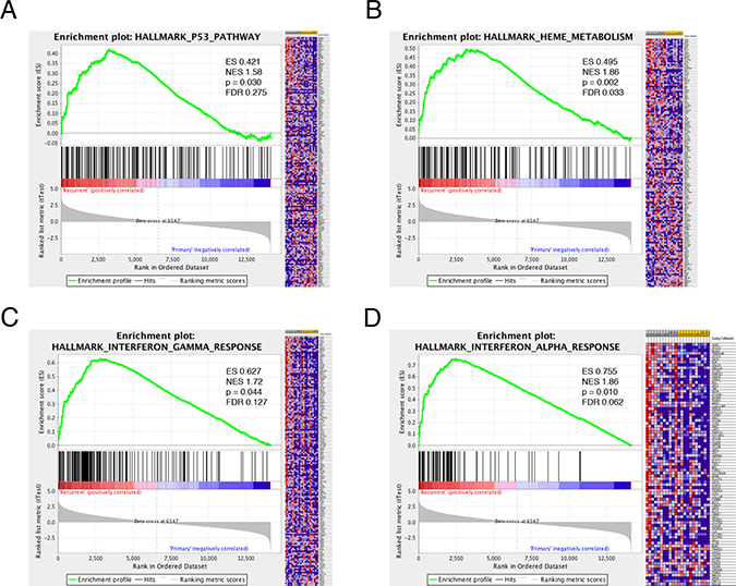 Figure 1: Gene Set Enrichment Analysis (GSEA) in recurrent glioma. GSEA of differential expression between recurrent and initial high-grade glioma demonstrates that recurrent GBM is enriched in genes that participate in the p53 tumor suppressor pathway (A), heme metabolism (B) and interferon signaling (C–D). ES–enrichment score, NES–normalized enrichment score, FDR–false discovery ratio.