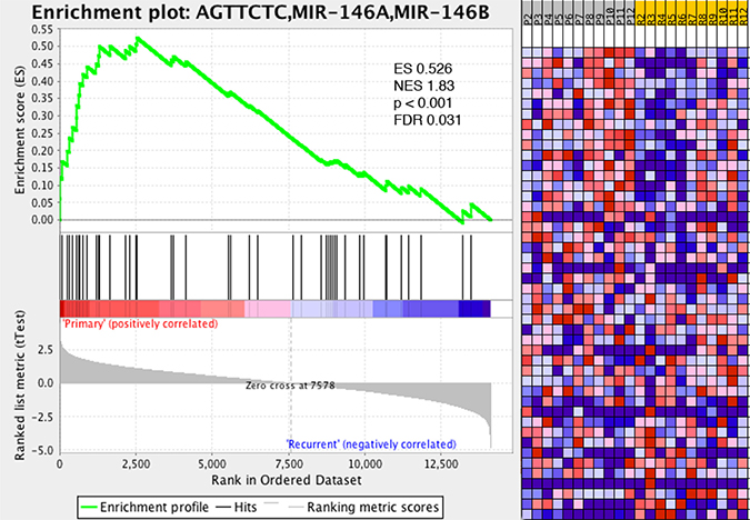 Figure 3: Immune-related gene set miR-146b associated with recurrent glioma. GSEA reveals gene set associated with targets of miR-146b associated with recurrent glioma, linking miRNA profiling results with RNA-seq gene expression analysis. ES–enrichment score, NES–normalized enrichment score, FDR–false discovery ratio.
