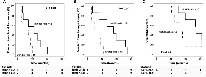 Figure 4: Clinical outcomes stratified by miR-146b expression ratio. Kaplan-Meier estimates of clinical outcomes stratified by high and low miR-146b ratios between recurrent vs initial tumors (A) freedom from local recurrence, (B) freedom from salvage surgery, and (C) overall survival.