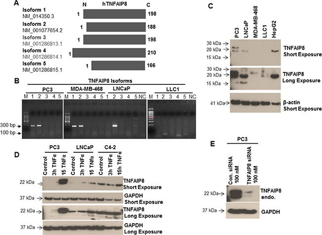 Figure 1: Analysis of the expression of TNFAIP8 isoforms in cancer cell lines. (A) Amino acid sequence alignment of the five protein isoforms of human TNFAIP8. The N-terminal region is variable, whereas the C-terminal region is highly conserved. (B) Total RNA from PC3, MDA-MB-468, LNCaP, and LLC1 cells were isolated and the expression of the five TNFAIP8 isoforms was analyzed using RT-PCR. PCR products were electrophoresed on a 1.5% agarose gel and stained with ethidium bromide. NC, negative control (no cDNA); M, markers. (C) Expression of TNFAIP8 protein isoforms in various types of cancer cell lines was analyzed by immunoblotting. Cell extracts (50 μg) were electrophoresed using SDS-PAGE and immunoblotted with anti-TNFAIP8 and anti-β-actin antibodies. (D) PC3, LNCaP, and C4-2 cells were cultured for 24 h and treated with TNFα (10 ng/ml) for 3 h and 15 h. Cell extracts (50 μg) were immunoblotted with anti-TNFAIP8 and anti-GAPDH antibodies. (E) PC3 cells were transfected with control siRNA or TNFAIP8 siRNA (100 nM) for 30 h. Cell extracts (50 μg) were immunoblotted with anti-TNFAIP8 and anti-GAPDH antibodies. Endo–endogenous.