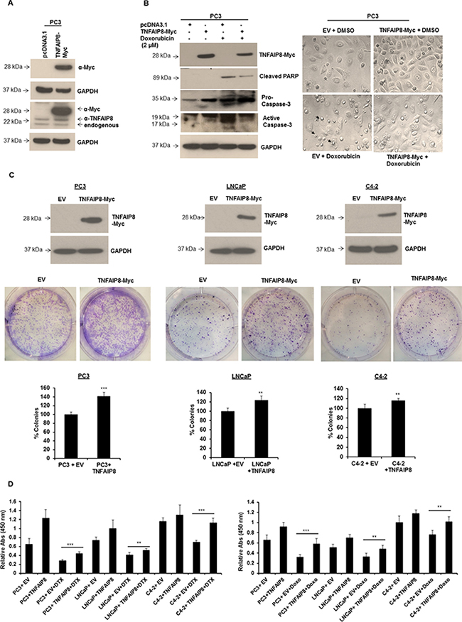 Figure 2: TNFAIP8 promotes cell colony formation and cell proliferation in prostate cancer cells. (A) PC3 cells were transfected with empty vector (EV) or TNFAIP8-Myc plasmids for 24 h. Cell extracts (50 μg) were immunoblotted with anti-Myc, anti-TNFAIP8, and anti-GAPDH antibodies. (B) PC3 cells were transfected with empty vector or TNFAIP8-Myc plasmids for 24 h. Cells were treated with DMSO or 2 μM doxorubicin (Doxo) for 24 h. Cell extracts (50 μg) were immunoblotted with anti-Myc, anti-cleaved PARP, anti-caspase 3, and anti-GAPDH antibodies (left panel). PC3 cells (1 × 105) were transfected with empty vector or TNFAIP8-Myc plasmid for 24 h. Cells were treated with DMSO or 2 μM doxorubicin for 24 h. Cells were imaged using a Nikon light microscope (40× objective; right panel) Arrows indicate the apoptotic cells. (C) PC3, LNCaP, and C4-2 cells were transfected with empty vector or TNFAIP8-Myc plasmid for 30 h. The expression of the TNFAIP8-Myc protein was analyzed by immunoblotting (upper panels). Transfected live cells (2000 cells/well) were re-plated in 6-well plates in triplicate and cultured at 37° C for 7 days. Cells were fixed, stained with crystal violet, counted, and plotted (middle and lower panels). (D) PC3, LNCaP, and C4-2 cells were transfected with the TNFAIP8-Myc plasmid or empty vector for 18 h and treated with DMSO or 0.5 nM of docetaxel (DTX) or 1 μM doxorubicin (Doxo) for 24 h. Cells were trypsinized and counted. Live cells (1 × 104 cells/well) were cultured for 48 h, and cell proliferation was measured using a WST-1 assay. Data are expressed as the mean ± S.D. **p < 0.01, ***p < 0.001, according to the two-tailed Student’s t-test.