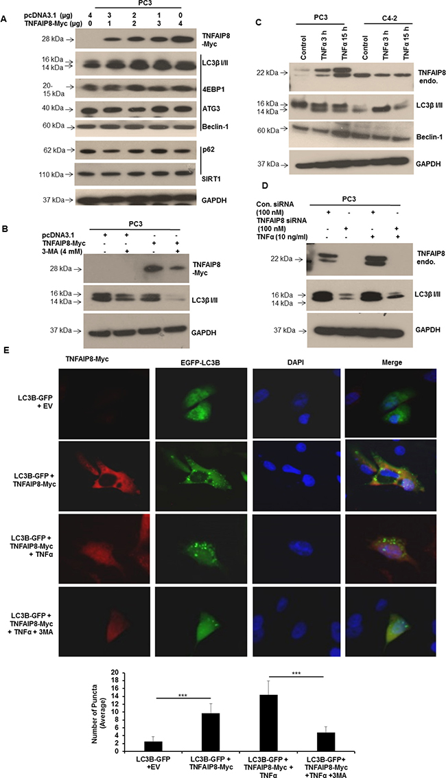Figure 4: TNFAIP8 induces autophagy in PC3 cells. (A) PC3 cells were transfected with empty vector or increasing amounts of TNFAIP8-Myc plasmid for 30 h. Cell extracts (50 μg) were electrophoresed using SDS-PAGE and immunoblotted with anti-Myc, anti-LC3β I/II, anti-4E-BP1, anti-ATG3, anti-Beclin 1, anti-p62, anti-SIRT1, and anti-GAPDH antibodies. (B) PC3 cells were transfected with empty vector or TNFAIP8-Myc plasmid and treated with 3-methyladenine (4 mM) for 24 h. Cell extracts (50 μg) were immunoblotted with anti-Myc, anti-LC3β I/II, and anti-GAPDH antibodies. (C) PC3 and C4-2 cells were cultured for 24 h and treated with TNFα (10 ng/ml) for 3 h and 15 h. Cell extracts (50 μg) were immunoblotted with anti-TNFAIP8, anti-LC3β I/II, anti-Beclin-1, and anti-GAPDH antibodies. Endo–endogenous. 3-MA – 3-methyladenine. (D) PC3 cells were transfected with control siRNA or TNFAIP8 siRNA (100 nM) and treated with TNFα (10 ng/ml) for 24 h as indicated. Cell extracts (50 μg) were immunoblotted with anti-TNFAIP8, anti-LC3β I/II and anti-GAPDH antibodies. Endo–endogenous. (E) PC3 cells were grown on coverslips in 6-well plates for 24 h and co-transfected with 2 μg of empty vector and GFP-tagged-LC3B plasmid or TNFAIP8-Myc plasmid and GFP-tagged LC3B plasmid. Cells were treated with 10 ng/ml TNFα and 4 mM 3-methyladenine for 24 h as indicated. TNFAIP8 was labeled using anti-Myc antibody and an Alexa-Fluor-568-conjugated secondary antibody. Nuclei were stained with DAPI. Cells were imaged using an OlympusBX60 fluorescent microscope (40× objective) (upper panels). The number of GFP-LC3B-related puncta formed in cells (n = 10) was counted and plotted (lower panels). Data are expressed as the mean ± S.D. ***p < 0.001, according to the two-tailed Student’s t-test.