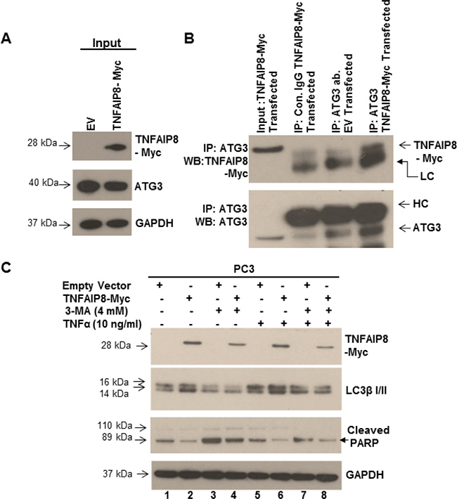 Figure 5: TNFAIP8 interacts with ATG3, induces autophagy, and inhibits apoptosis. (A) PC3 cell extracts (50 μg) from empty vector- or TNFAIP8-Myc-transfected cells were immunoblotted with anti-Myc, anti-ATG3, and anti-GAPDH antibodies (input panel). (B) Cell lysates (1 mg) from empty vector- or TNFAIP8-Myc-transfected PC3 cells were immunoprecipitated with control IgG or anti-ATG3 antibody and immunoblotted with anti-TNFAIP8-Myc and anti-ATG3 antibody. LC- light-chain IgG, HC- heavy-chain IgG. (C) PC3 cells were transfected with empty vector or TNFAIP8-Myc plasmid and treated with 3-methyladenine (4 mM) and TNFα (10 ng/ml) for 24 h as indicated. Cell extracts (50 μg) were immunoblotted with anti-Myc, anti-TNFAIP8, anti-LC3β I/II, anti-cleaved PARP, and anti-GAPDH antibodies.