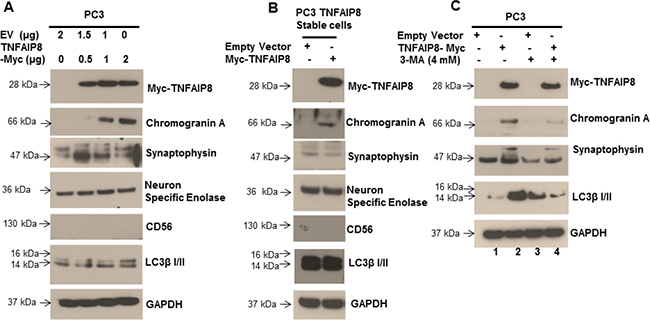 Figure 6: TNFAIP8 increases the expression of NED biomarkers in prostate cancer PC3 cells. (A) PC3 cells were transfected with empty vector or increasing amounts of TNFAIP8-Myc plasmid for 30 h. The effect of TNFAIP8 protein expression on NED biomarkers, such as chromogranin A, synaptophysin, NSE, and NCAM-1/CD56, as well as the autophagy marker LC3β I/II was analyzed by immunoblotting. (B) Effect of stable TNFAIP8 expression on NED markers in PC3 cells. Cell extracts from PC3 cells stably expressing TNFAIP8 were analyzed by immunoblotting with the indicated antibodies. (C) PC3 cells were transfected with empty vector or TNFAIP8-Myc plasmid and treated with 3-methyladenine for 24 h. The effect of TNFAIP8 expression, with and without 3-methyladenine, on the expression of NED and autophagy markers, was analyzed by immunoblotting.