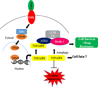 Figure 7: The involvement of the TNFAIP8 protein in autophagy. The model represents the expression and involvement of TNFAIP8 in autophagy formation. The model also indicates the important role of TNFAIP8 in determining cell fate during TNFα signaling.