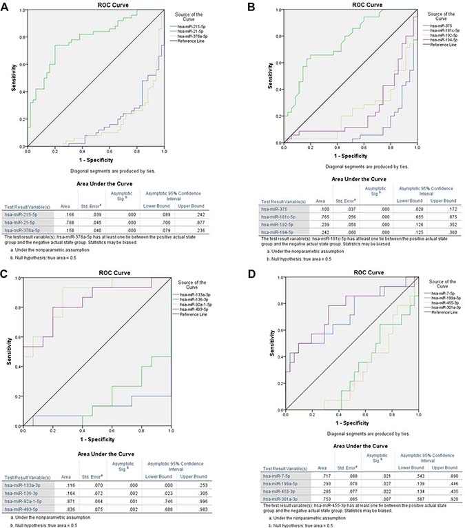 Figure 4: Receiver operating characteristic (ROC) analysis of miRNAs for all significant dysregulated miRNAs for colorectal cancer (A) as well as for rectal (B) and colon cancer (C) separately were performed and most promising candidates are shown here. Furthermore we calculated ROC curves for miRNAs with the highest potential to distinguish between colon and rectal cancer tissue samples (D). We selected three microRNAs miR-21-5p (AUC 0.79, 95% CI 0.70–0.88), miR-215-5p (AUC 0.83, 95% CI 0.76–0.91) and miR-378a (AUC 0.84, 95% CI 0.76–0.92) which were the most promising candidates for colorectal cancer. Each marker had an area under the curve (AUC) of ≥ 0.79 for detecting CRC selectively at a Padj < 0.01 (A). ROC analysis also revealed that hsa-miR-375 had the best sensitivity for detecting rectal cancer, with an area under the curve (AUC) of 0.90 (95% CI 0.83–0.97) (B). Hsa-miR-133a-3p, in contrast, had the highest sensitivity for detecting colon cancer, with an AUC above 0.88 (95% CI 0.75–1.0) (C). Finally, when comparing colon cancer tissue directly to rectal cancer tissue, the ROC analysis indicated that hsa-miR-7-5p and hsa-miR-301a-5p had a fairly good specificity for detecting colon cancer (vs. rectal cancer) presence, but with an AUC only above 0.72 (D).