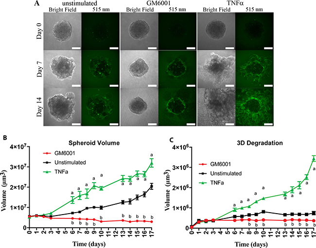 Figure 3: TNFα stimulation of OSCC cells leads to increased matrix degradation and spheroid volume. (A) Representative confocal images of UMSCC1 formed spheroids at Day 0, 7, and 14. Spheroid volume was revealed through bright-field imaging and Geltrex degradation through 505 nm excitation of BSA-Green degradation marker. Scale bar, 100 μm. (B) Spheroid volume over a period of 17 days in the presence or absence of TNFα (10 ng/mL) or GM6001 (25 μM). (C) Geltrex degradation volume over a period of 17 days in the presence or absence of TNFα (10 ng/mL) or GM6001 (25 μM). Volumes are presented as mean per spheroid ± SEM. Two-way ANOVA followed by Bonferroni post hoc test: a, P < 0.01 TNFα vs. unstimulated; b, P < 0.01 for GM6001 vs. unstimulated; n = 3.