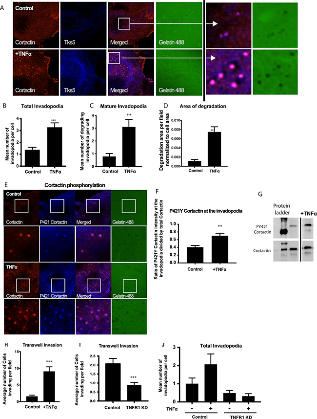 Figure 4: Treatment with TNFα stimulates invadopodium formation in UMSCC1 cells. UMSCC1 cells were plated on a thin gelatin matrix and incubated for 24 hours in the presence or absence of TNFα (10 ng/mL). (A) Representative images of UMSCC1 cells forming invadopodia in green fluorescence gelatin - cortactin (red), Tks5 (blue) and gelatin (green). The total number of invadopodia (B) and mature invadopodia (C) per cell were counted. Area of gelatin degradation was measured in the while field and normalized to the area of the cell in the field (D). Representative images of cortactin phosphorylation in invadopodia formed in UMSCC1 cell in the presence or absence of TNFα (10 ng/mL). Cortactin (red), P421 Cortactin (blue), gelatin (green) (E). We have calculated the ratio of mean pixel intensity (MFI) of phosphorylated P421Y cortactin at the invadopodia in the presence or absence of TNFα (10 ng/mL) and divided by the MFI of total cortactin in the same pixel, and the results are shown in (F). A total of 76 cells were analyzed in 3 experiments. Representative western blot of cortactin tyrosine residue 421 phosphorylation and total cortactin expression after TNFα stimulation. (G). For transwell experiments, we calculated the average number of UMSCC1 cells invading per Transwell imaging field (H) in UMSCC1 cells with TNFR1 knockdown (I) and the formation of invadopodia (J) in the presence or absence of TNFα (10 ng/mL). One-way ANOVA followed by Dunnett’s multiple comparison test: **P < 0.01; ***, P < 0.001. n = 3 for invadopodia experiments and western blot, n = 5 for transwell experiments.