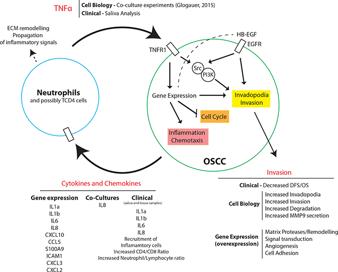 We further analyzed the role of TNFα in cancer invasion using two-dimensional (2D) and three-dimensional (3D) invasion assays. We demonstrate that TNF-α promotes invadopodia formation, maturation and OSCC invasion in a phosphoinositide 3-kinase (PI3K) and Src-dependent mechanism. Our results support a novel mechanism by which neutrophils are recruited to OSCC, promoting TNFα secretion and leading to OSCC gene expressional changes and overall poor survival.