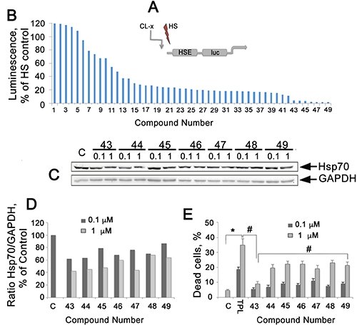 Figure 1: Analysis of 49 compounds analogous to CL-158 with different substituents R1-R7 on its pharmacophore, strophanthidin. (A) Diagram of HSE-luc, a HSPs promoter reported integrated to HeLa cells. (B) Reporter assay of 49 analogues of CL-158. Reporter HeLa cells (transfected with plasmid bearing the luciferase gene under the HSE promoter) were seeded into wells of a 96-well plate and then heat-shocked to activate luciferase expression. Compounds at a concentration of 0.5 μM were administrated immediately after heat shock, and cells were kept at 37° C for the next 20 h before analysis. TPL was used as a reference compound. (C) Western blot of HCT-116 cells incubated with selected compounds at concentrations of 0.1 and 1 μM, for 20 h. (D) Ratio Hsp70/GAPDH intensity was evaluated as in Figure 1C. Representative data from three experiments are shown. (E) Toxicity of elected compounds measured as LDH activity in cell medium. *p < 0,05, **p < 0,01.