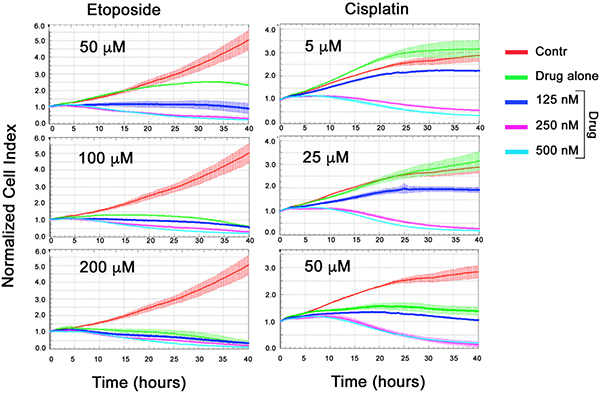 Figure 5: Synergistic effect of CL-43 and anti-cancer drugs. HCT-116 cells were incubated with CL-43 in concentrations 125, 250 and 500 nM in combination with etoposide (50, 100 or 200 μM) or with cisplatin (5, 25 or 50 μM) added to cell culture at the same time. Recording was started immediately after drug administration and lasted 40 h.